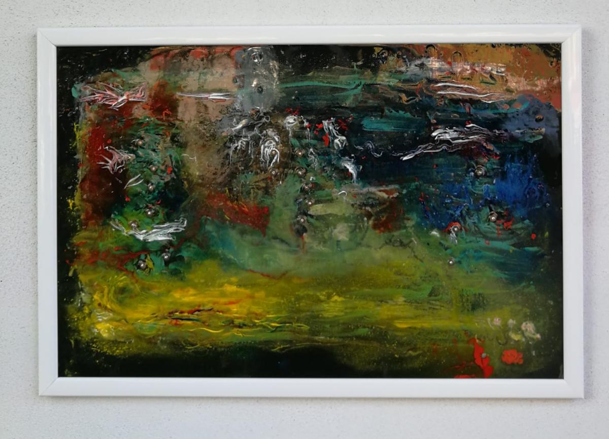 Opera realizzata con acrilici, materiali di recupero e resina.